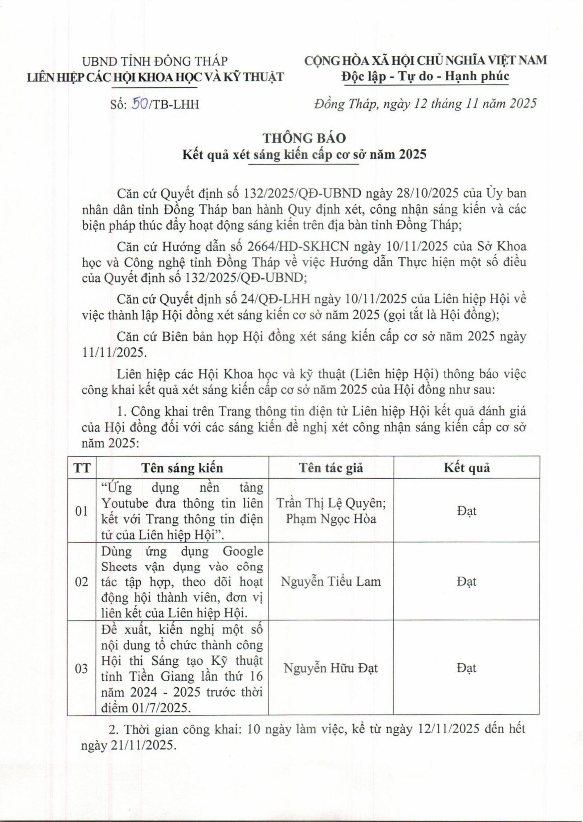 Thông báo kết quả xét sáng kiến cấp cơ sở năm 2025