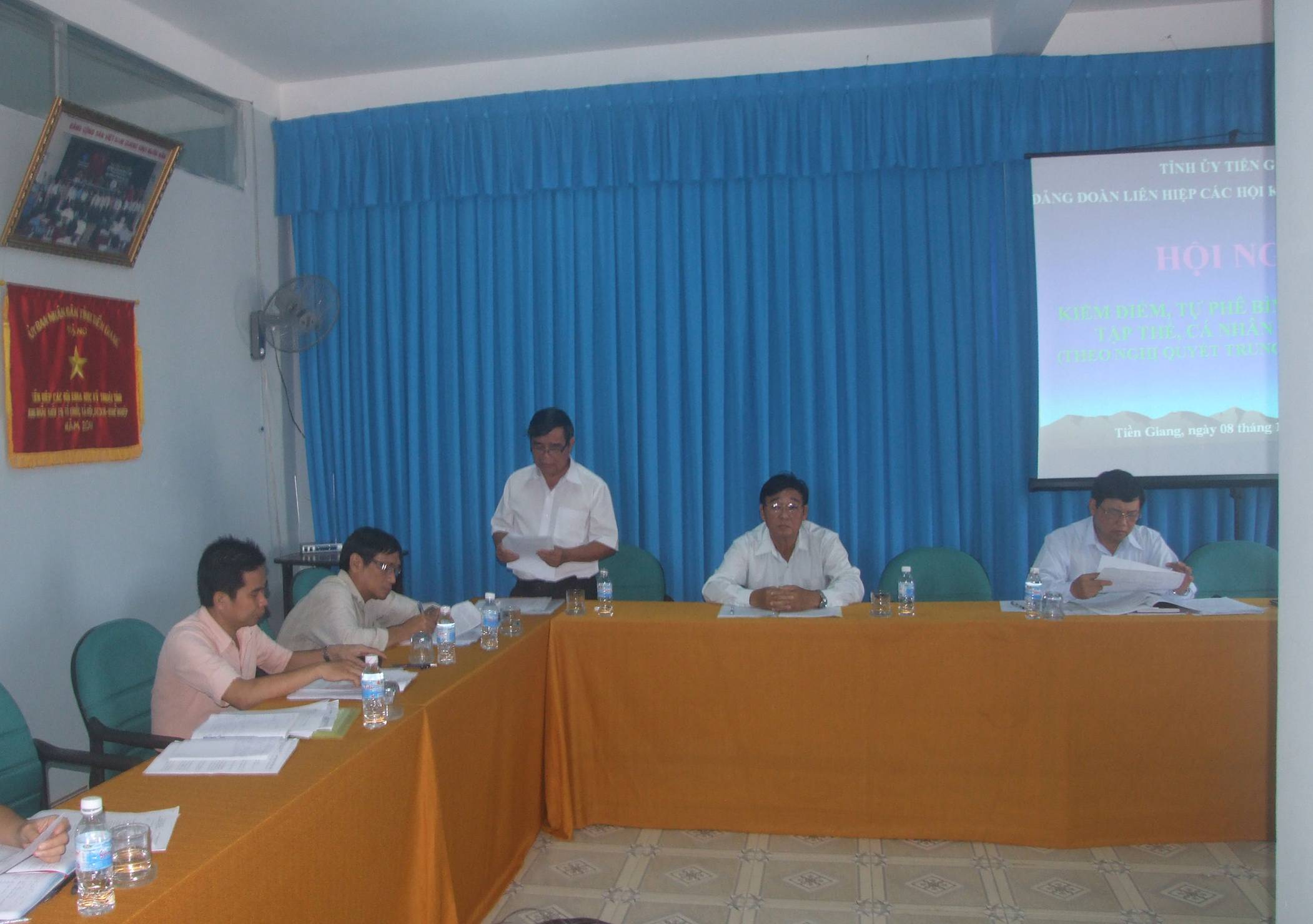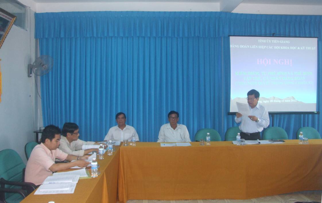 Sáng ngày 08/11/2012, Đảng Đoàn Liên hiệp các Hội Khoa học và Kỹ thuật tỉnh Tiền Giang (Đảng đòan Liên hiệp Hội) tổ chức hội nghị kiểm điểm tự phê bình và phê bình tập thể và cá nhân theo Nghị quyết Trung ương 4 (khóa XI) “Một số vấn đề cấp bách về xây dựng Đảng hiện nay”. Ông Nguyễn Anh Tuấn, Ủy viên Ban thường vụ, Trưởng Ban Tuyên giáo Tỉnh ủy làm Trưởng nhóm công tác thực hiện Nghị quyết Trung ương 4 của tỉnh, gồm đại diện Ban Tổ chức, Văn phòng, Ủy ban Kiểm tra, Ban Tuyên giáo và Ban Dân vận Tỉnh ủy, được phân công theo dõi và chỉ đạo hội nghị. |