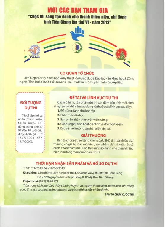 Mời bạn tham gia Cuộc thi sáng tạo dành cho thanh thiếu niên nhi đồng tỉnh Tiền Giang lần thứ VI - năm 2013