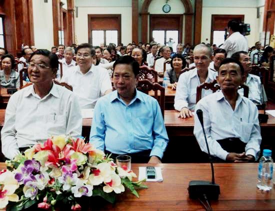 Bí thư Tỉnh ủy Trần Thế Ngọc (giữa),  Chủ tịch Liên hiệp Hội Trần Hoàng Diệu (trái) và các đại biệu dự họp mặt.