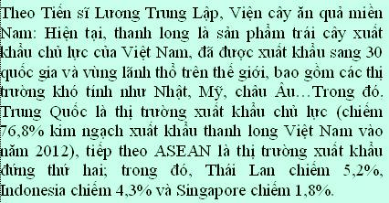 Theo Sở Công thương Tiền Giang, trong năm 2012, Sở đã xây dựng và tổ chức triển khai dự án “Hỗ trợ xuất khẩu trái cây các tỉnh đồng bằng sông Cửu Long – Mô hình thí điểm tại tỉnh Tiền Giang”. Trong đó, đã chọn trái thanh long để phân tích chuỗi giá trị, đề ra các giải pháp nâng cấp chuỗi giá trị, triển khai thực hiện và phổ biến nhân rộng mô hình.