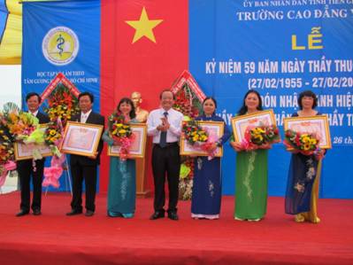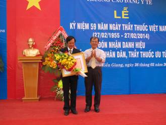 Ngày 26-2, Trường Cao đẳng Y tế Tiền Giang tổ chức lễ kỷ niệm 59 năm “Ngày Thầy thuốc Việt Nam” (27/2/1955-27/2/2014) và đón nhận các danh hiệu: “Thầy thuốc Nhân dân”, “Thầy thuốc Ưu tú”. Đến dự có TS.Trần Thanh Đức, TUV - Phó chủ tịch UBND tỉnh, đại diện lãnh đạo các sở, ngành tỉnh, các cán bộ lãnh đạo, cán bộ ngành y tế đã nghỉ hưu, đại diện một số cơ sở y tế đóng trên địa bàn tỉnh cùng trên 1.000 học sinh, sinh viên (HS-SV) đại diện cho hơn 3.800 HS-SV đang theo học tại trường. |