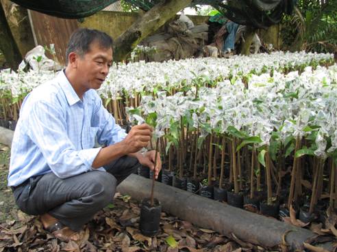 Theo anh Thành, thời gian ươm tạo cây giống hoàn chỉnh mất khoảng 9-10 tháng; trong đó, thời gian tạo gốc ghép từ 6-7 tháng, thời gian từ khi ghép bo đến khi cây đâm chồi, đẻ nhánh hoàn chỉnh mất khoảng 3 tháng. Để tạo gốc ghép, anh sử dụng hạt bình bát để ươm trong bầu (dùng xơ dừa chứa trong bọc ny lon), khi thân cây lên cao 70-80 cm thì tiến hành bấm đọt để lại chiều cao từ 25-30 cm (để tập trung nuôi thân) và khi đường kính thân cây đạt 10 cm, thì tiến hành ghép bo. Về bo giống, thay vì sử dụng da (vỏ cây) để ghép như lối truyền thống, anh áp dụng phương pháp ghép cành, vừa ít hao bo giống, vừa khắc phục rủi ro trong quá trình ghép (nếu da bị dập 1 góc nhỏ thì bo ghép sẽ bị thối, hư). Khi ghép, chú ý chọn cành tơ, khoẻ, cành giống từ khi cắt đến khi ghép không quá 48 giờ (tốt nhất là từ 24 – 36 giờ). Bo ghép trong 2 tuần bắt đầu liền da, sau 3-4 tuần đâm chồi, khi đó có thể cắt bỏ nhánh của gốc ghép. Trong quá trình ghép, chú ý chừa lá thở từ gốc ghép (giúp cây quang hợp, nuôi thân), cắt da phía trên chỗ ghép để cây tập trung nhựa nuôi dưỡng nhánh ghép. Ngoài ra, sử dụng nylon bao kín khu vực chỗ ghép để giữ ẩm.