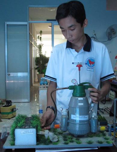 | Nguyễn Đoàn Hữu Hòa với mô hình “Dùng hổn hợp khí để đuổi và diệt chuột” |