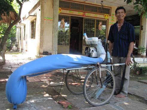 Bên cạnh thu gom lúa đổ, chiếc máy trên còn được sử dụng để hút bụi, rác trên đường rất hiệu quả. Vận hành cho chúng tôi xem, chiếc máy có thể hút sạch cát, bụi, rác thậm chí những viên đá nhỏ (anh dùng bao vải để hứng ở đầu ra) trên sân đan nhà anh rất tuyệt vời. Theo anh Hứng, nếu được nghiên cứu thiết kế với quy mô, công suất lớn hơn (sử dụng động cơ dầu), chiếc máy này có thể sử dụng để hút bụi rác trên đường, đặc biệc là dọc 2 bên con lươn trên Quốc lộ 1 A hay các trên tuyến đường nội ô, nội thị rất hiệu quả do vừa đảm bảo vệ sinh môi trường, tạo vẻ mỹ quan, vừa giúp tiết kiệm đáng kế chi phí thuê mướn nhân công.