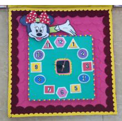 Điển hình như trò chơi “Thử tài cùng Chuột Mickey”. Khi mở hộp ra, bên trong có 1 mặt đồng hồ hình con vật chạy bằng pin, có kim giờ, phút, trên mặt có 12 khuôn hình đặt 12 khối hình mang chữ số từ 1 đến số 12, mỗi số nằm trên một khối hình học, các khối hình có thể lấy ra và đặt vào theo ý thích, có thể nhận biết giờ và khối hình theo yêu cầu của kim đồng hồ.