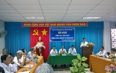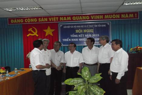 Sáng ngày 14/01/2016, Liên hiệp các hội khoa học và kỹ thuật Tiền Giang (Liên hiệp hội) tổ chức Hội nghị tổng kết công tác năm 2015 và triển khai nhiệm vụ năm 2016. Chủ trì hội nghị Ông Trần Hoàng Diệu – Chủ tịch Liên hiệp hội Tiền Giang; tham dự Hội nghị có Giáo sư - Tiến sĩ khoa học Đặng Vũ Minh – Chủ tịch Liên hiệp hội Việt Nam; Ông Phạm Anh Tuấn – Phó chủ tịch Ủy ban nhân dân tỉnh Tiền Giang cùng đại diện các sở, ban, ngành, đoàn thể tỉnh, các hội thành viên, đơn vị thành viên liên kết, các đồng chí trong Ban chấp hành Liên hiệp hội. |