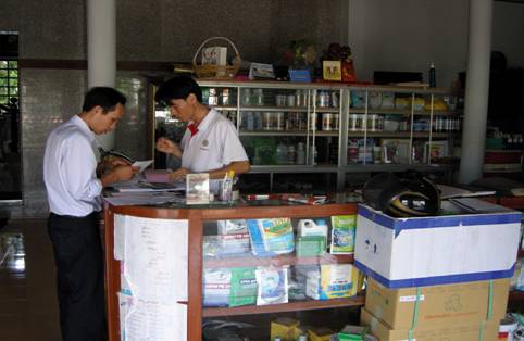 Cán bộ ngành Nông nghiệp đang kiểm tra đại lý thuốc ở xã Phú Tân,
