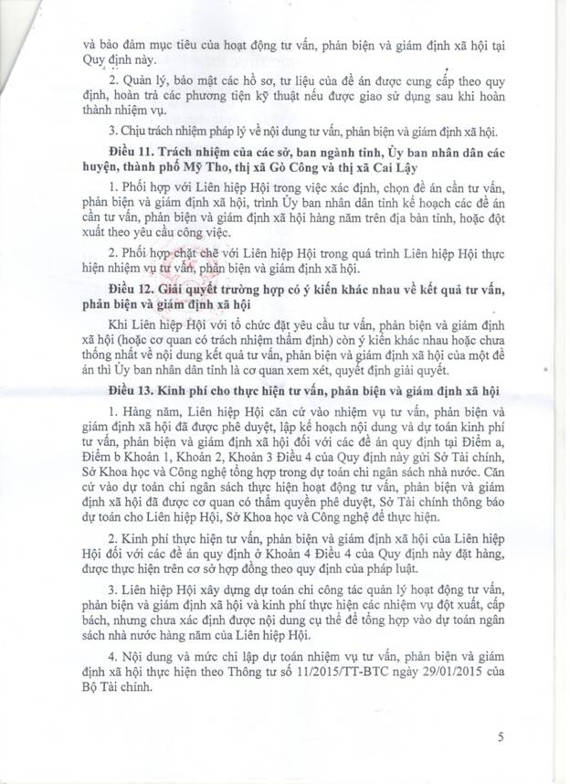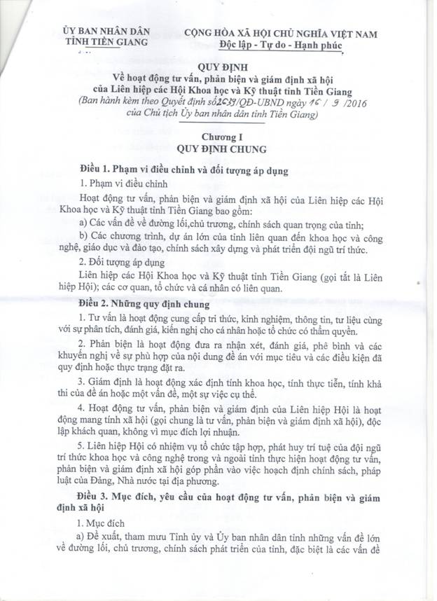 Quyết định số 2639/QĐ-UBND ngày 16/9/2016 của UBND tỉnh Tiền Giang ban hành Quy định về hoạt động tư vấn, phản biện và giám định xã hội của Liên hiệp các Hội Khoa học và Kỹ thuật tỉnh Tiền Giang