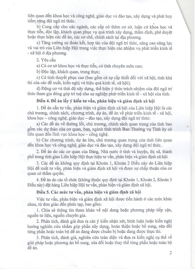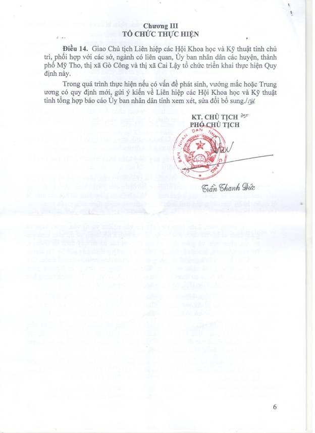 | Ngày 16/9/2016, Ủy ban nhân dân tỉnh Tiền Giang ban hành Quyết định số 2639/QĐ-UBND Quy định về hoạt động tư vấn, phản biện và giám định xã hội của Liên hiệp các Hội Khoa học và Kỹ thuật tỉnh Tiền Giang thay thế Quyết định số 1804/QĐ-UBND ngày 25/5/2009. | |