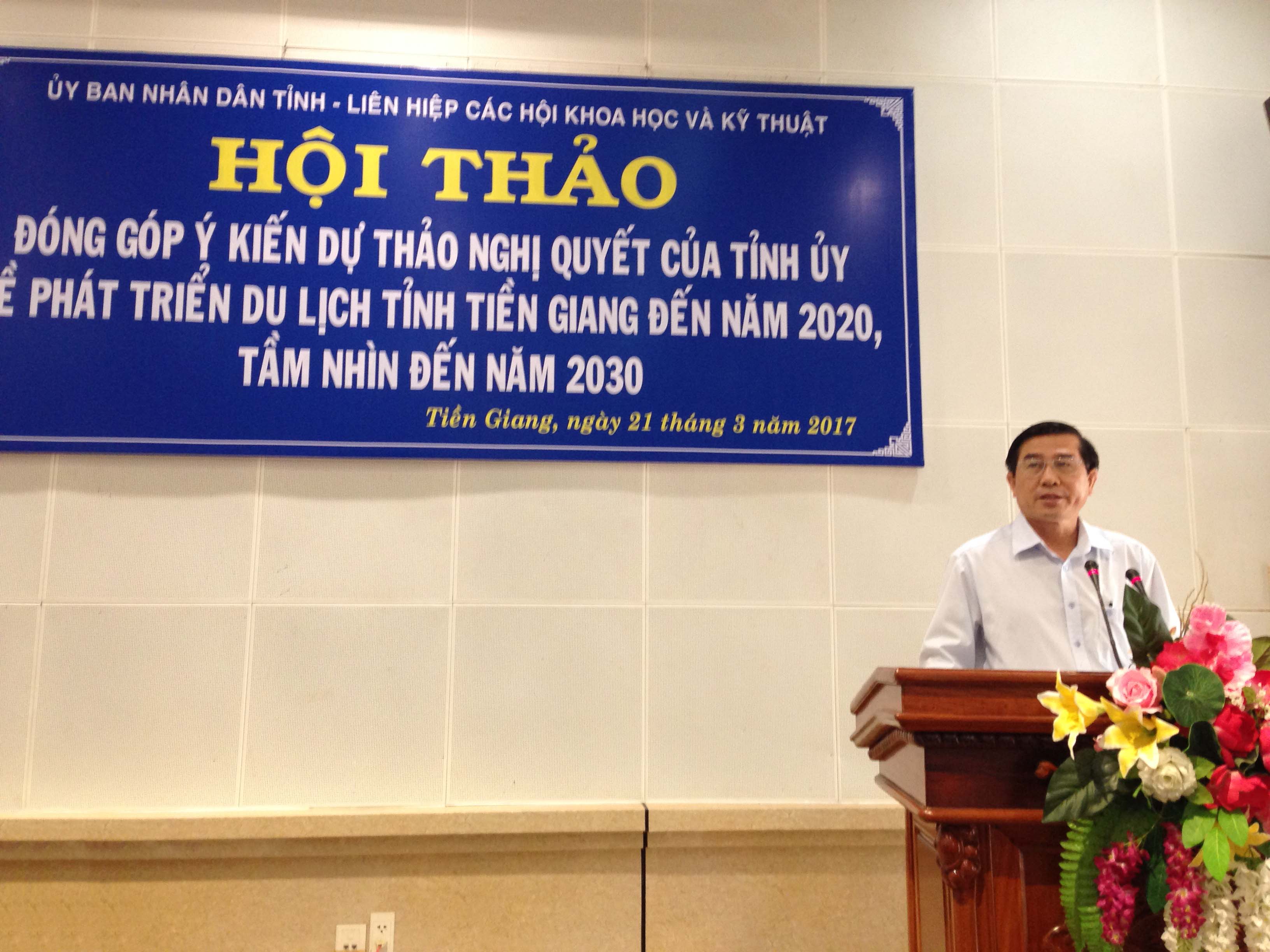 Ngày 21/3/2017, UBND tỉnh phối hợp với Liên hiệp các Hội Khoa học và Kỹ thuật tỉnh Tiền Giang (Liên hiệp Hội) tổ chức hội thảo đóng góp ý kiến dự thảo Nghị quyết của Tỉnh ủy về phát triển du lịch tỉnh Tiền Giang đến năm 2020, tầm nhìn đến năm 2030. TS Lê Văn Hưởng, Chủ tịch UBND tỉnh, TS. Trần Thanh Đức, Phó Chủ tịch UBND tỉnh và TS Nguyễn Văn Khang, Chủ tịch Liên hiệp Hội đồng chủ trì hội thảo.