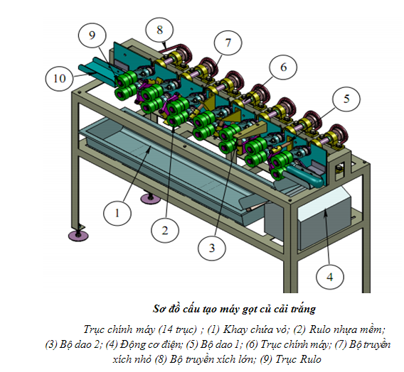 Về thiết kế, lắp đặt dao cắt: 6 bộ dao gồm 12 cái, mỗi dao được bố trí lệch nhau 1 góc 30 độ theo chu vi đường tròn (bao quanh củ cải) nên khi củ cải đi từ bộ dao cắt thứ nhất đến bộ dao cắt thứ sáu, vỏ của nó sẽ được gọt gần như triệt để (khoảng 98%). Khoảng hở giữa 2 rulo và dao có thể tăng giảm tùy theo đường kính của nguyên liệu đưa vào gọt (nhờ bộ lò xo đàn hồi) nên lớp vỏ được gọt có bề dày tương đối như nhau. Ngoài ra, nhờ bố trí bộ biến tần nên tốc độ gọt của máy có thể được điều chỉnh theo ý muốn.