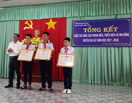 Chiều ngày 12/7/2018, Ban tổ chức Cuộc thi sáng tạo thanh thiếu niên và nhi đồng năm 2018 (Cuộc thi) huyện Cai Lậy tổ chức tổng kết và trao giải Cuộc thi của huyện. Ông Nguyễn Ngọc Ánh – Phó Chủ tịch Liên hiệp các Hội Khoa học và Kỹ thuật tỉnh Tiền Giang (Liên hiệp Hội), Phó Ban tổ chức Cuộc thi tỉnh Tiền Giang và ông Võ Văn Nhanh – Phó Chủ tịch UBND huyện Cai Lậy, Trưởng ban tổ chức Cuộc thi huyện Cai Lậy đã đến dự. |