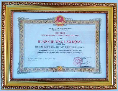 Ngày 30/7/2018, Chủ tịch Nước CHXHCNVN ký ban hành Quyết định số 1327/QĐ-CTN tặng Huân chương Lao động hạng Ba cho Liên hiệp các Hội Khoa học và Kỹ thuật tỉnh Tiền Giang (Liên hiệp Hội), đã có thành tích xuất sắc trong công tác từ năm 2013 đến năm 2017, góp phần vào sự nghiệp xây dựng chủ nghĩa xã hội và bảo vệ Tổ quốc.