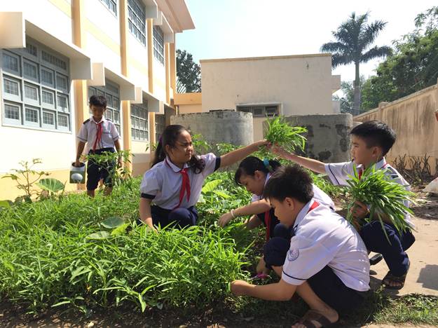 Học sinh thu hoạch rau muống.