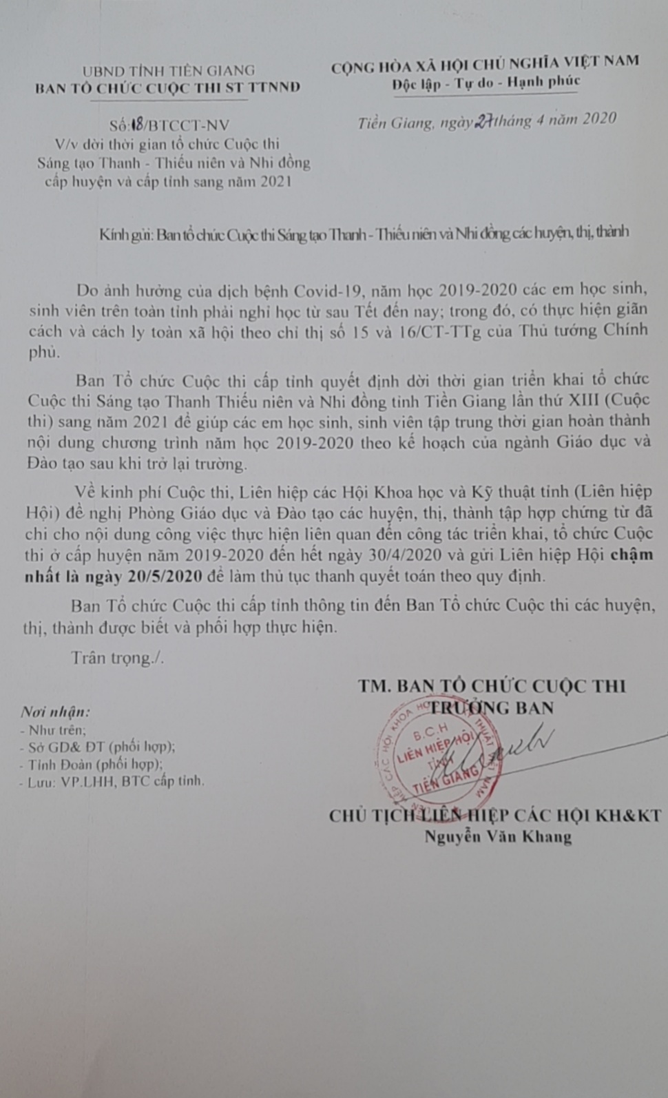 Nội dung Công văn nêu: Vừa qua, do ảnh hưởng của dịch bệnh Covid-19, năm học 2019-2020 các em học sinh, sinh viên trên toàn tỉnh phải nghỉ học từ sau Tết đến cuối tháng 4/2020; trong đó, có thực hiện giãn cách và cách ly toàn xã hội theo chỉ thị số 15 và 16/CT-TTg của Thủ tướng Chính phủ. Do đó, Ban Tổ chức Cuộc thi cấp tỉnh quyết định dời thời gian triển khai tổ chức Cuộc thi Sáng tạo Thanh Thiếu niên và Nhi đồng tỉnh Tiền Giang lần thứ XIII (Cuộc thi) sang năm 2021 để giúp các em học sinh, sinh viên tập trung thời gian hoàn thành nội dung chương trình năm học 2019-2020 theo kế hoạch của ngành Giáo dục và Đào tạo sau khi trở lại trường…