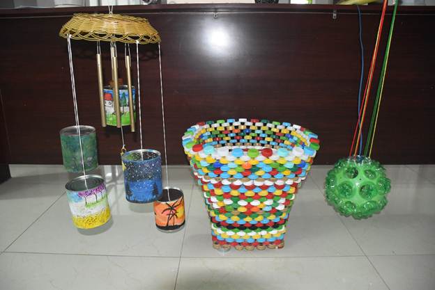 Chuông gió, sọt đựng giấy, đèn ngủ được em Nhung sáng tạo ra từ những chất liệu phế thải