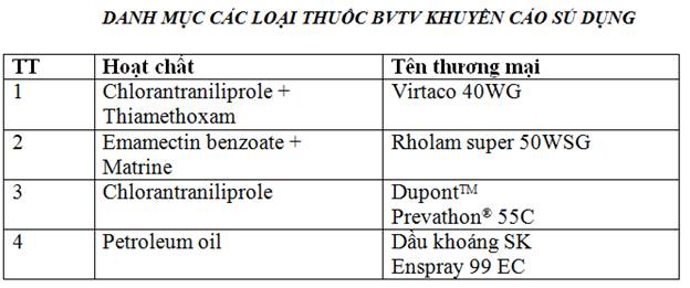 Sử dụng luân phiên một trong các loại thuốc BVTV có hoạt chất như: Chlorantraniliprole + Thiamethoxam (Vitraco 40WG), Emamectin benzoate + Matrine (Rholam super 50WSG) kết hợp với chất lan trải bề mặt hay dầu khoáng nông nghiệp để tăng tính hiệu quả và hạn chế tính kháng thuốc của sâu. Phun 5 lần thuốc BVTV trên vụ trái (lần 1: khi trái được 4 tuần tuổi; lần 2: sau khi phun lần 1 là 2 tuần; lần 3: sau khi phun lần 1 là 4 tuần; lần 4: sau khi phun lần 1 là 8 tuần; lần 5: sau khi phu lần 1 là 12 tuần).
