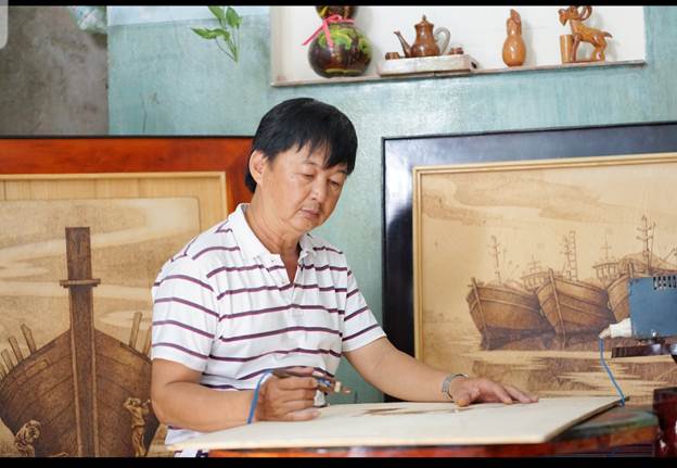Nghệ nhân Lê Minh Sĩ đang tác nghiệp tranh bút lửa