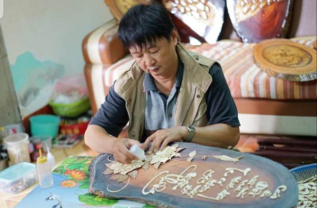 gỗ làm nền, thiết kế bố cục phù hợp có ý nghĩa rất quan trọng. Theo đó, ông thường sử dụng lõi cây mít, xà cừ, hay dái ngựa… để xẻ tấm (hình oval) làm nền cho bức tranh; tiếp theo dùng cưa lọng để lọng chữ, hoa, lá theo mẫu thiết kế (được vẽ trên giấy và dán lên mặt gỗ). Để lọng chữ gỗ, ông thường sử dụng gỗ cây lòng mứt do có màu trắng khá nổi bậc cùng độ bền, dai, không bị gãy, vỡ khi lọng; để tạo hoa, lá trang trí, ông sử dụng gỗ dừa và lòng mứt để lọng, mài (hay chạm, khắc) tạo hình. Sau bước làm tinh (mài, bào láng, sơn), các chi tiết trên được dán lên tấm gỗ nền, phun PU để tăng độ bóng, giữ màu được lâu và chống trầy xướt.