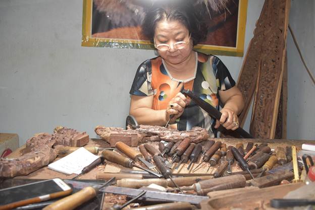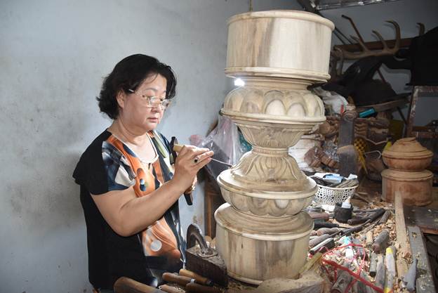 Nghệ nhân Nguyễn Thi Tuyết Huệ đang chạm khắc tác phẩm