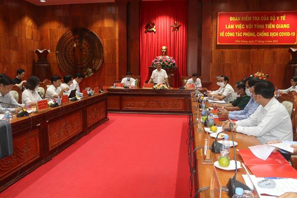 Ngày 27/4, Đoàn công tác của Bộ Y tế do Phó Giáo sư – Tiến sĩ Nguyễn Trường Sơn, Thứ trường Bộ Y tế làm Trưởng đoàn đã đến kiểm tra công tác phòng chống dịch bệnh Covid – 19 tại Tiền Giang. Phó Bí thư Tỉnh ủy, Chủ tịch UBND tỉnh Tiền Giang Nguyễn Văn Vĩnh tiếp và làm việc với Đoàn công tác của Bộ Y tế.