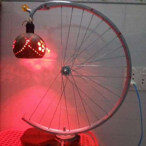 Bộ đèn ngủ hình bán nguyệt được làm từ chiếc vành xe đạp cũ được cắt bớt một nửa, một đầu lắp trên đế gỗ, đầu còn lại được lắp một đèn trung thu làm bằng gáo dừa trông rất tinh xảo, đẹp mắt.