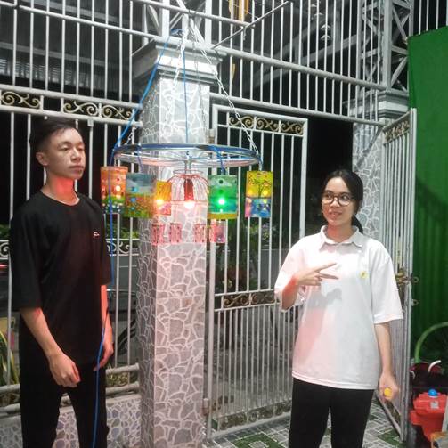 Sau gần 1 tháng mài mò, nghiên cứu, 2 em Huỳnh Phan Nhung và Huỳnh Phan Đan Tú đã hoàn thiện bộ sản phẩm “Đèn tái chế” trông rất lạ mắt và được xem là có một không hai. Bộ sản phẩm do 2 em sáng tạo ra gồm: Bộ đèn chùm và bộ đèn ngủ hình bán nguyệt. Trong đó, để tạo ra bộ đèn chùm, 2 em sử dụng niềng xe đạp cũ (cắt bớt 1 dãy căm, chà nhám, sơn bạc), xung quanh treo 6 ống vắt đũa được sơn phết, trang trí tỉ mỉ và lắp bóng đèn bên trong; một giỏ hoa cũ được treo ngược vào giữa vành xe, xung quanh có treo nhiều lọ tăm được đính cúc áo, hạt cườm với nhiều sắc màu sặc sỡ. Bộ đèn chùm có thể treo lên cao nhờ 4 đoạn dây xích và mọc khóa.