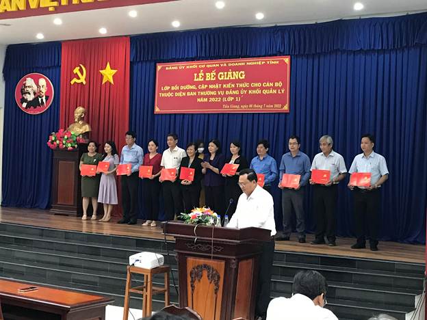 Chiều ngày 8/7/2022, Đảng ủy Khối cơ quan và Doanh nghiệp tỉnh tổ chức Lễ bế giảng lớp bồi dưỡng, cập nhật kiến thức cho cán bộ thuộc diện Ban Thường vụ Đảng ủy Khối cơ quan và Doanh nghiệp quản lý năm 2022 (lớp 1). Tham dự Lễ bế giảng có ông Nguyễn Thành Trung, Phó Bí thư Đảng ủy Khối cùng các đồng chí trong Ban chỉ đạo lớp học.