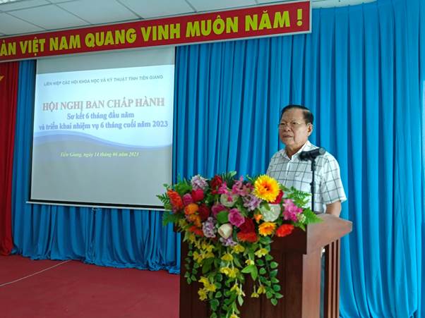 Sáng ngày 14/6/2023, Liên hiệp các Hội khoa học và Kỹ thuật (Liên hiệp Hội) Tiền Giang tổ chức sơ kết 6 tháng đầu năm 2023, triển khai phương hướng nhiệm vụ 6 tháng cuối năm 2023. Đến dự hội nghị có ông Phạm Văn Trọng – Tỉnh ủy viên, Phó Chủ tịch Ủy ban nhân dân (UBND) tỉnh, TS. Nguyễn Văn Khang – Bí thư Đảng Đoàn Chủ tịch Liên hiệp Hội; quý đại biểu là Ủy viên Ban Thường vụ, Ủy viên Ban Chấp hành Liên hiệp Hội; tham dự hội nghị còn có quý đại biểu là đại diện lãnh đạo các sở, ngành tỉnh, đại diện lãnh đạo Hội thành viên và thành viên liên kết (ngoài Ban Chấp hành). |