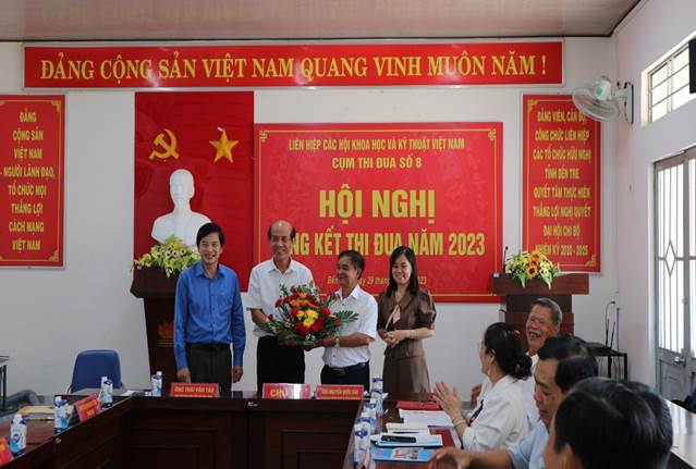 Sáng ngày 29/12/2023, tại tỉnh Bến Tre, Liên hiệp các Hội Khoa học và Kỹ thuật (Liên hiệp Hội) Cụm 8 (Bắc sông Hậu) tổ chức Hội nghị tổng kết thi đua năm 2023. Tham dự Hội nghị có đại diện lãnh đạo Liên hiệp Hội các tỉnh Bế Tre, Vĩnh Long, Tiền Giang, Trà Vinh, Đồng Tháp (vắng Liên hiệp Hội An Giang). Ông Nguyễn Quốc Bảo, Ủy viên Đoàn chủ tịch Liên hiệp Hội Việt Nam, Chủ tịch Liên hiệp Hội tỉnh Bến Tre (đơn vị Cụm trưởng) và ông Thái văn Tào (Cụm phó), Phó chủ tịch Liên hiệp Hội Vĩnh Long đồng chủ trì Hội nghị. |