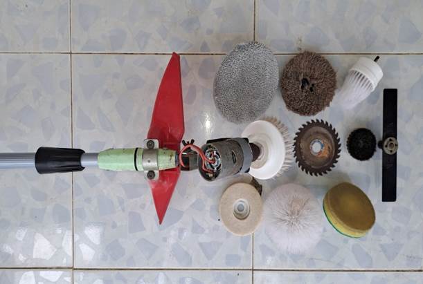 Hai em cho biết, phong trào Xanh – Sạch – Đẹp luôn được Nhà trường quan tâm và thực hiện xuyên suốt để không gian lớp học, trường học luôn sạch sẽ, thoáng mát. Việc lau sạch bụi các ô cửa kính, quét trần, hay lau sàn phải được thực hiện thường xuyên và tốn không ít thời gian. Xuất phát từ nhu cầu thực tế đó, chúng em đã sáng tạo ra Máy lau kính đa năng để vừa giúp tiết kiệm thời gian và sức lao động trong việc lau kính, lau sàn, lau trần nhà, cắt tỉa cỏ,... vừa tận dụng các vật liệu phế thải đã qua sử dụng như cán cây lau nhà, cây quét trần nhà đã qua sử dụng. Các bông lau kính, lau sàn được tái chế từ đá nhám và thảm, khăn cũ; động cơ là motor 775 sử dụng nguồn điện 12V – 24V, có thể sử dụng lại motor trong các bình phun thuốc trừ sâu, máy bơm mini; nguồn điện là pin 12V như pin của các loại máy khoan, máy mài cầm tay thông dụng.