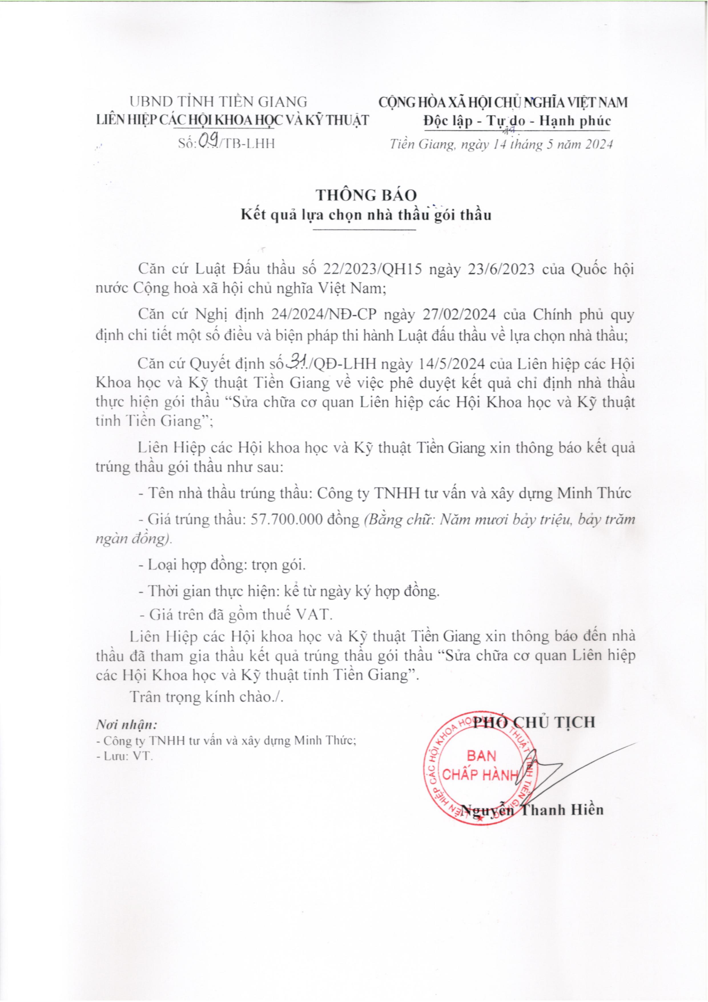 THÔNG BÁO KẾT QUẢ LỰA CHỌN NHÀ THẦU GÓI THẦU 2024