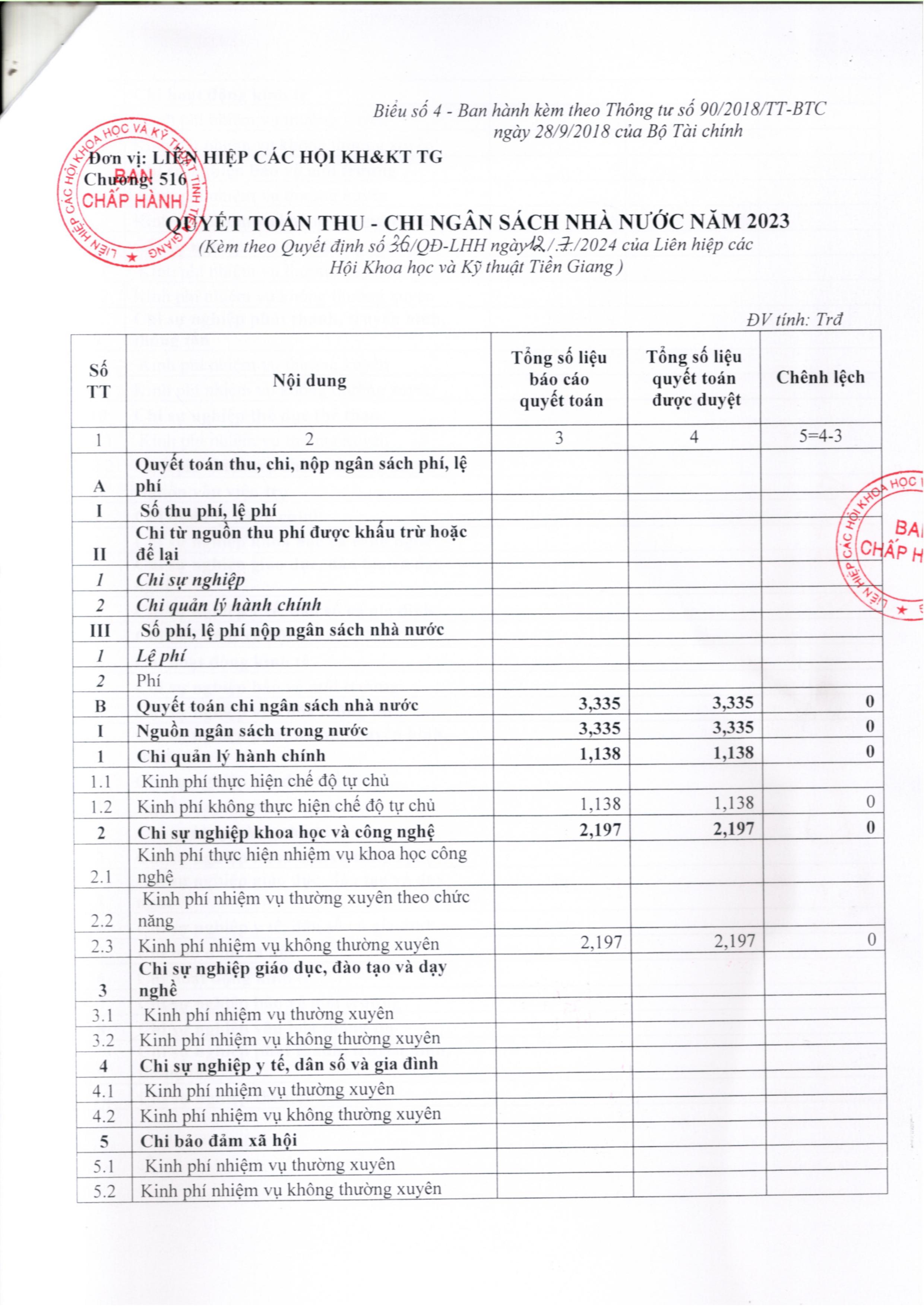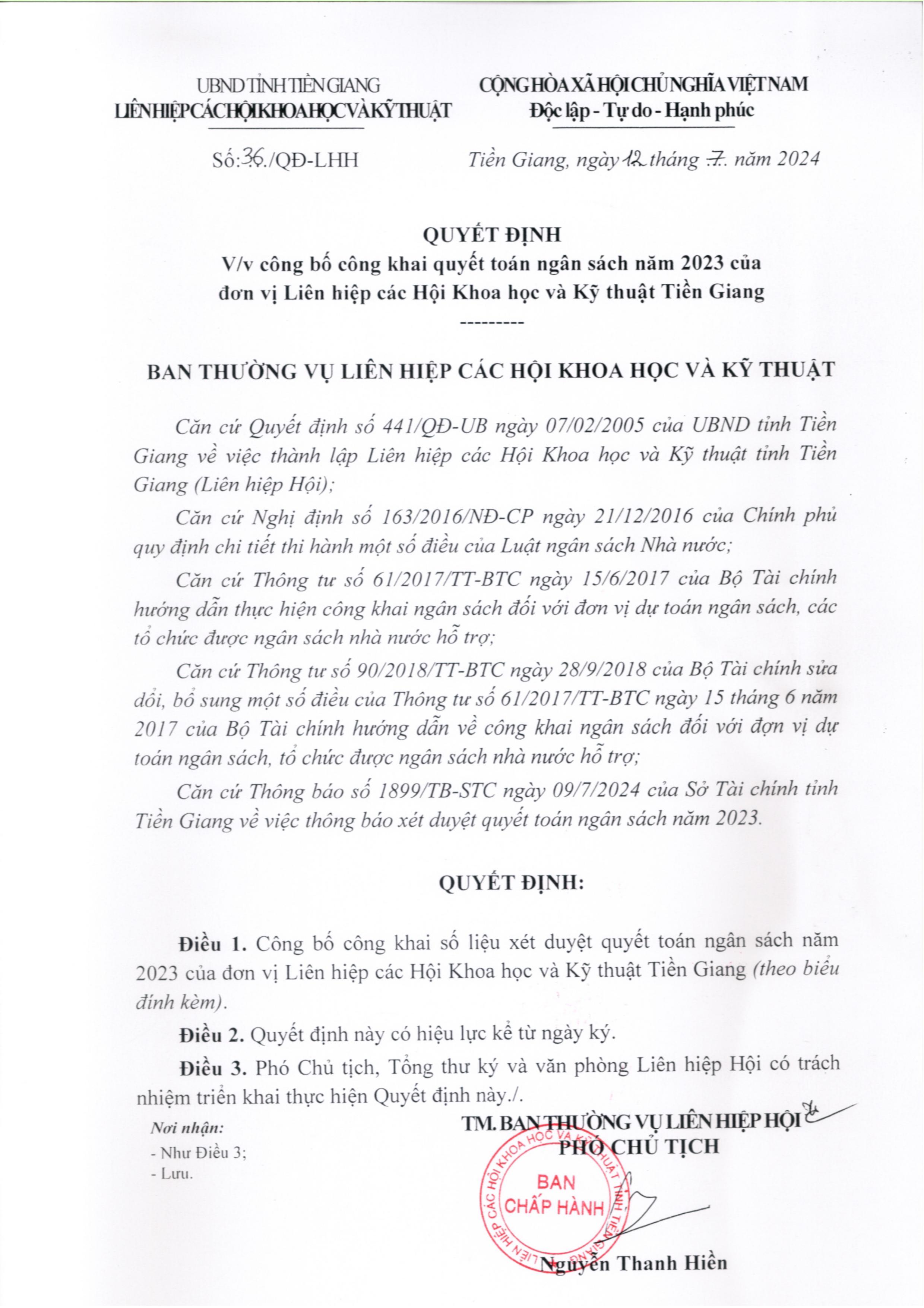 QUYẾT ĐỊNH CÔNG BỐ CÔNG KHAI QUYẾT TOÁN NGÂN SÁCH NĂM 2023 CỦA LIÊN HIỆP CÁC HỘI KHOA HỌC VÀ KỸ THUẬT TIỀN GIANG