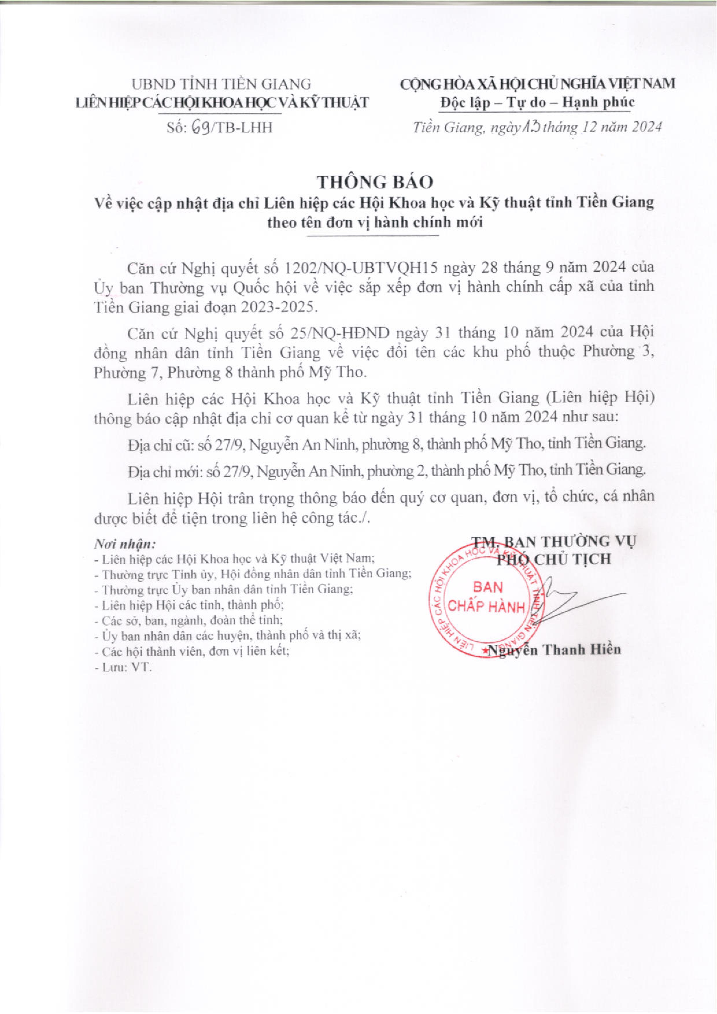 THÔNG BÁO VỀ VIỆC CẬP NHẬT ĐỊA CHỈ LIÊN HIỆP CÁC HỘI KHOA HỌC VÀ KỸ THUẬT TIỀN GIANG