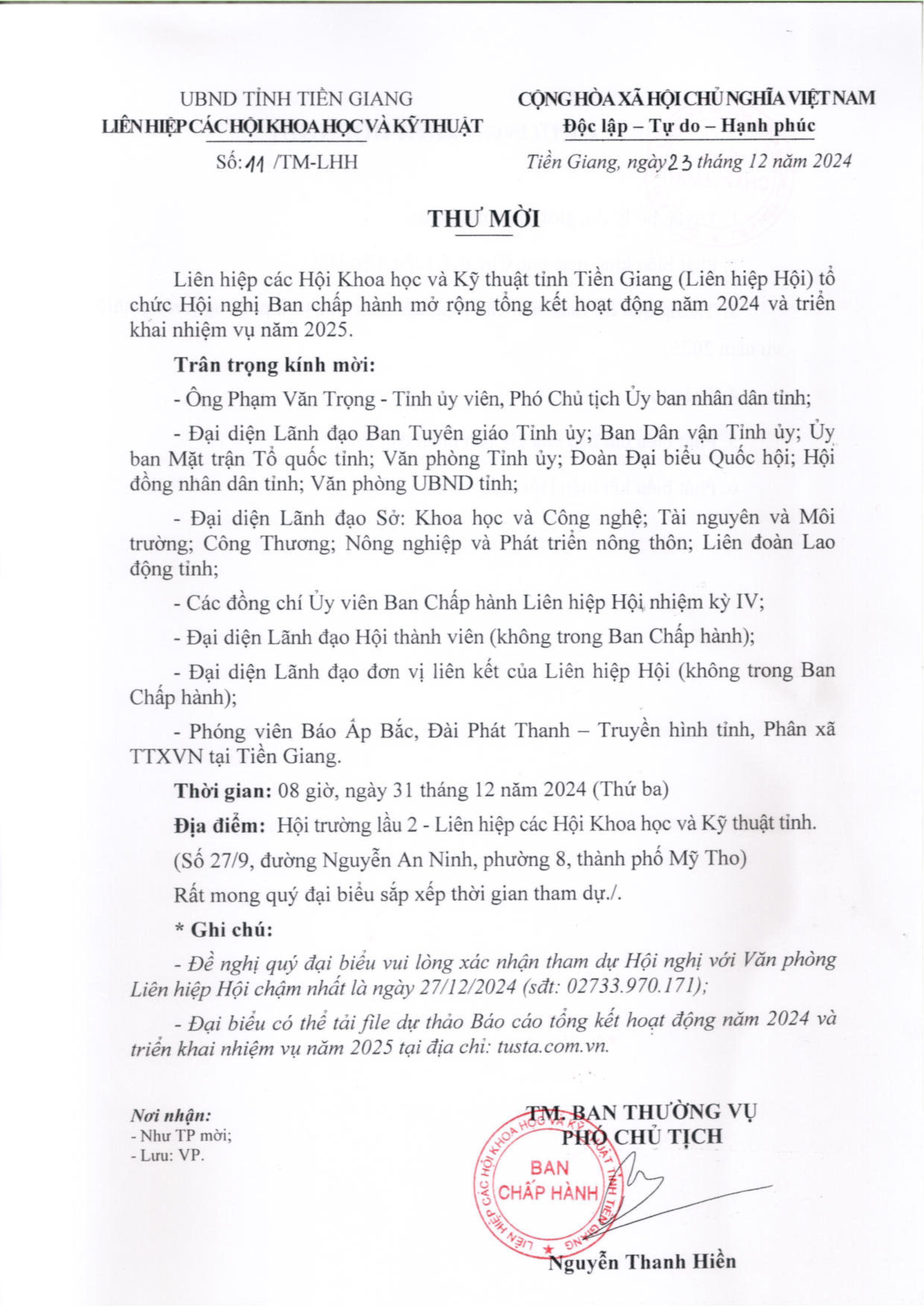 Thư mời tổng kết Hội thi sáng tạo kỹ thuật tỉnh Tiền Giang lần thứ XVI, năm 2024-2025
