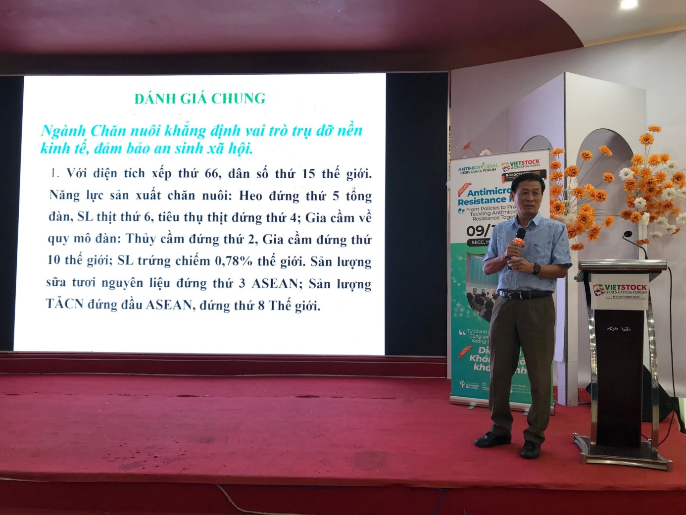 Tiến sĩ Nguyễn Quốc Đạt, Phó Chủ tịch Hội Chăn nuôi Việt Nam chia sẻ thông tin về những cơ hội và thách thức của ngành chăn nuôi gia cầm ở Việt Nam; trong đó, giá trị xuất khẩu của ngành chăn nuôi năm 2024 đạt 550 ngàn tỷ đồng (khoảng 22 tỷ USD), tăng 5,4%, đóng góp 26,7% vào GDP ngành nông nghiệp và khoảng 5% GDP quốc gia. Sản phẩm ngành chăn nuôi đáp ứng đủ nhu cầu tiêu dùng cho hơn 100 triệu dân trong nước, khách du lịch quốc tế và đóng góp mục tiêu xuất khẩu. Bên cạnh đó, ngành chăn nuôi gà thịt của Việt Nam nói chung và Đồng Tháp nói riêng là chi phí sản xuất cao, tiềm ẩn dịch bệnh, quy trình chăn nuôi chưa hiện đại so với một số nước trong khu vực, nhất là có sự cạnh tranh gay gắt từ thịt gà đông lạnh nhập khẩu…