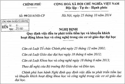 Ngày 25/10/2014, Chính phủ đã ban hành Nghị định số 99/2014/NĐ-CP quy định việc đầu tư phát triển tiềm lực và khuyến khích hoạt động khoa học và công nghệ (KHCN) trong các cơ sở giáo dục đại học.Nghị định có 6 Chương và 19 Điều. Chi tiết »