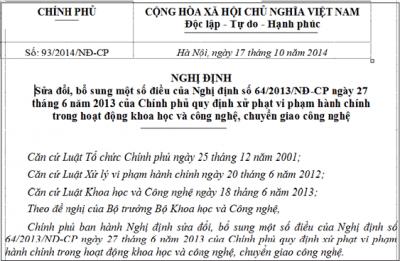 Ngày 17 tháng 10 năm 2014 Chính phủ ban hành Nghị định số 93/2014/NĐ-CP sửa đổi, bổ sung một số điều của Nghị định số 64/2013/NĐ-CP ngày 27 tháng 6 năm 2013 của Chính phủ quy định xử phạt vi phạm hành chính trong hoạt động khoa học và công nghệ, chuyển giao công nghệ. Chi tiết »