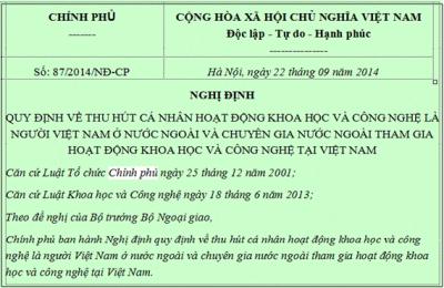 Ngày 22 tháng 09 năm 2014 Chính phủ ban hành Nghị định số 87/2014/NĐ-CP Quy định về thu hút cá nhân hoạt động khoa học và công nghệ là người Việt Nam ở nước ngoài và chuyên gia nước ngoài tham gia hoạt động khoa học và công nghệ tại Việt Nam. Nghị định này quy định chính sách thu hút, thẩm quyền quyết định và quy trình chấp thuận việc sử dụng cá nhân hoạt động khoa học và công nghệ là người Việt Nam ở nước ngoài và chuyên gia nước ngoài tham gia hoạt động khoa học và công nghệ tại Việt Nam; trách nhiệm thực hiện của các cơ quan, tổ chức và cá nhân liên quan. Chi tiết »