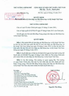 Ngày 21/10/2015, Thủ tướng Chính phủ ký ban hành Quyết định số 1795/QĐ-TTg phê chuẩn Điều lệ Liên hiệp các Hội Khoa học và Kỹ thuật Việt Nam. Chi tiết »