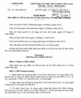 Ngày 14/6/2016, Chính phủ ban hành Nghị định số 54/2016/NĐ-CPQuy định cơ chế tự chủ của tổ chức khoa học và công nghệ công lập. Chi tiết »
