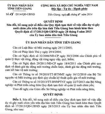 Sửa đổi, bổ sung một số điều của Quy định tạm thời về việc dẫn dụ và gây nuôi chim yến trên địa bàn tỉnh Tiền Giang ban hành kèm theo Quyết định số 17/2013/QĐ-UBND ngày 28 tháng 5 năm 2013 của Ủy ban nhân dân tỉnh Tiền Giang.  Chi tiết »