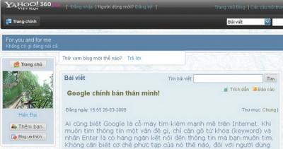 TTO - Những chia sẻ về việc sử dụng Google hay việc chia sẻ thông tin hữu ích để khi mọi người "Google" là có thể tìm thấy đã được blogger Hiện Đại bày tỏ tại blog Yahoo! 360plus.  Chi tiết »