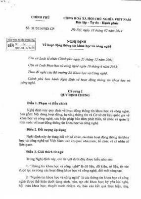 Ngày 18/02/2014, Chính phủ đã ban hành Nghị định số 11/2014/NĐ-CP về hoạt động thông tin khoa học và công nghệ (Nghị định thay thế Nghị định 159/2004/NĐ-CP ngày 31/8/2004). Chi tiết »