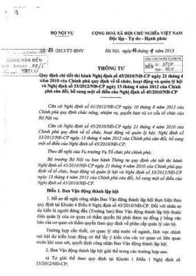Quy định chi tiết thi hành Nghị định số 45/2010/NĐ-CP ngày 21 tháng 4 năm 2010 của Chính phủ quy định về tổ chức, hoạt động và quản lý hội và Nghị định số 33/2012/NĐ-CP ngày 13 tháng 4 năm 2012 của Chính phủ sửa đổi, bổ sung một số điều của Nghị định số 45/2010/NĐ-CP.  Chi tiết »