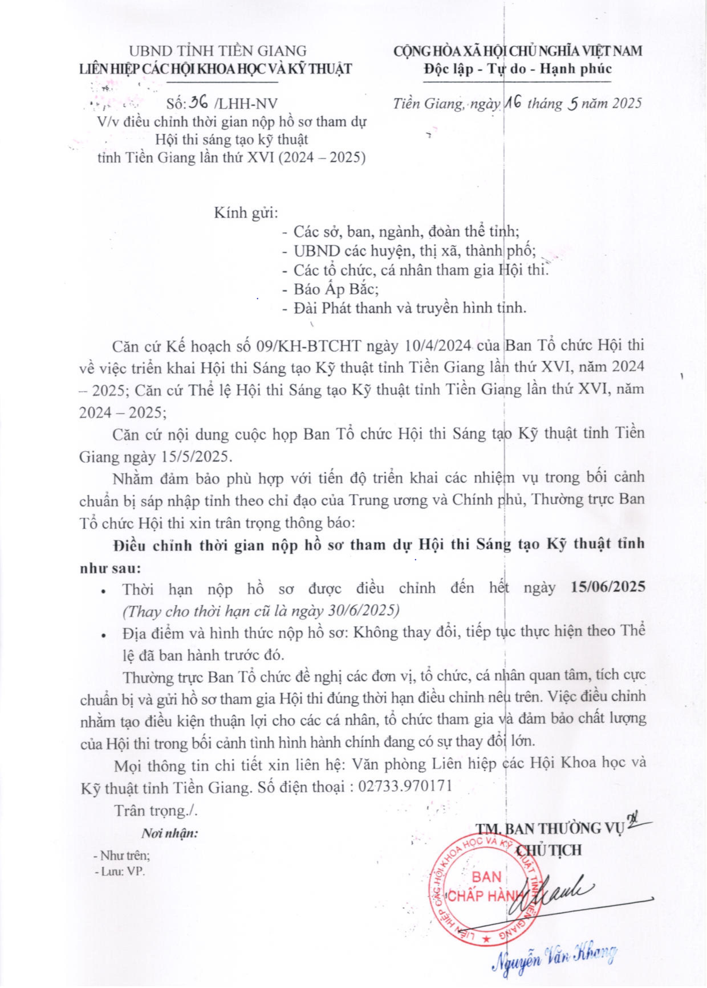 Thông báo về việc điều chỉnh thời gian nộp hồ sơ tham dự HTSTKT tỉnh TG lần thứ XVI (2024-2025)